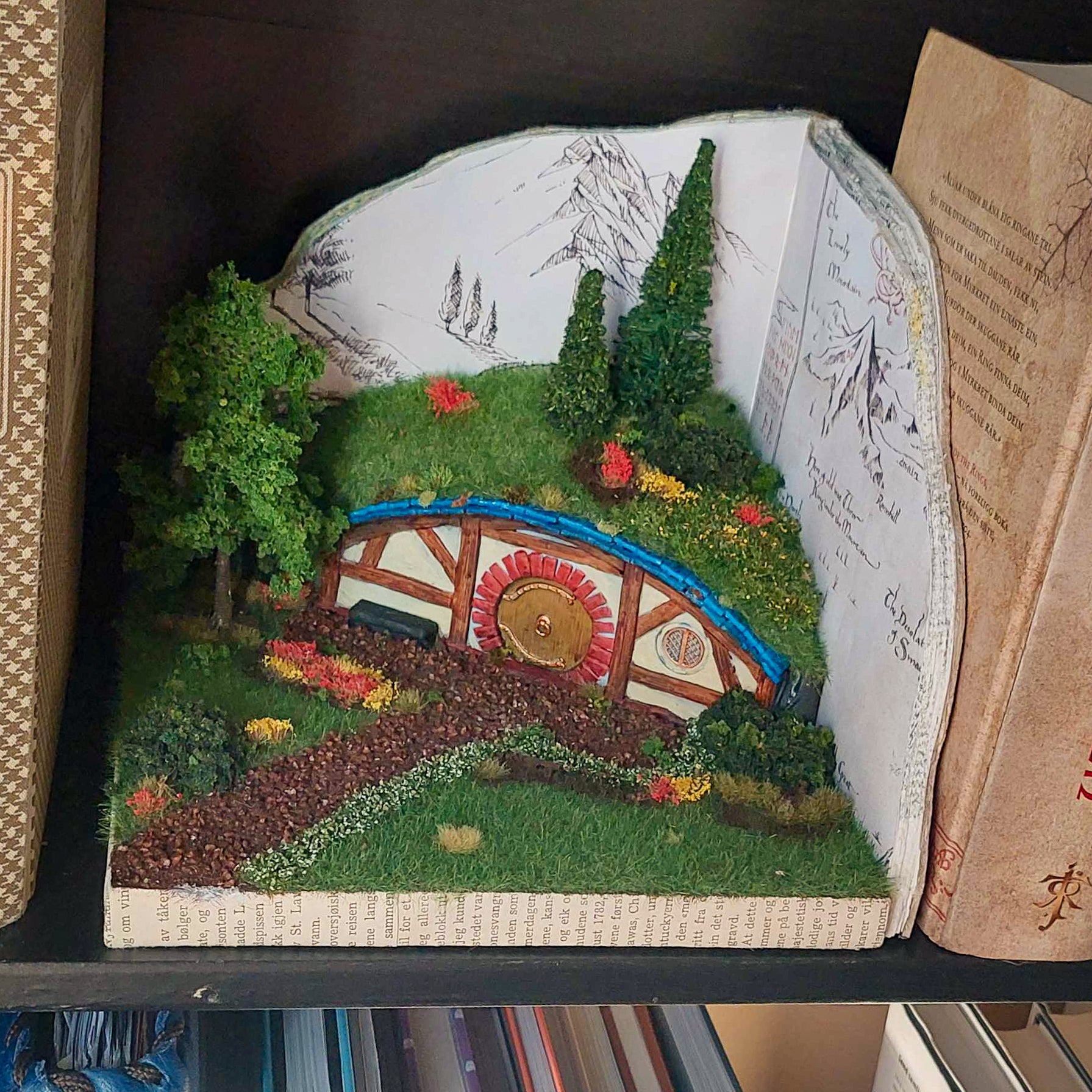 Denne bokkroken kan du bruke som bokende, pynt på stovebordet eller i ei hylle blandt plantene. Bak hobbithola finn du kartet Bilbo og dvergane brukte på reise til Einsamberget.