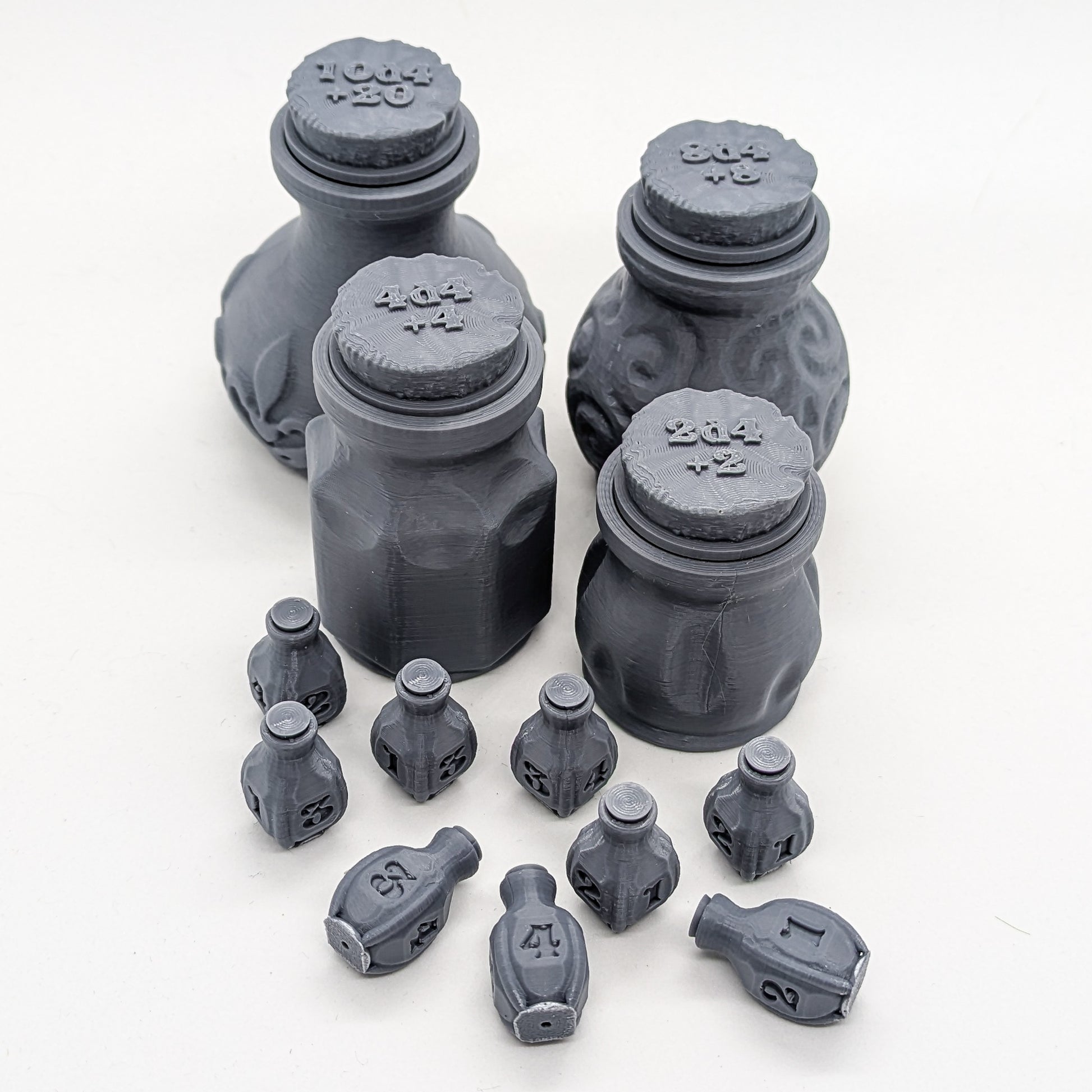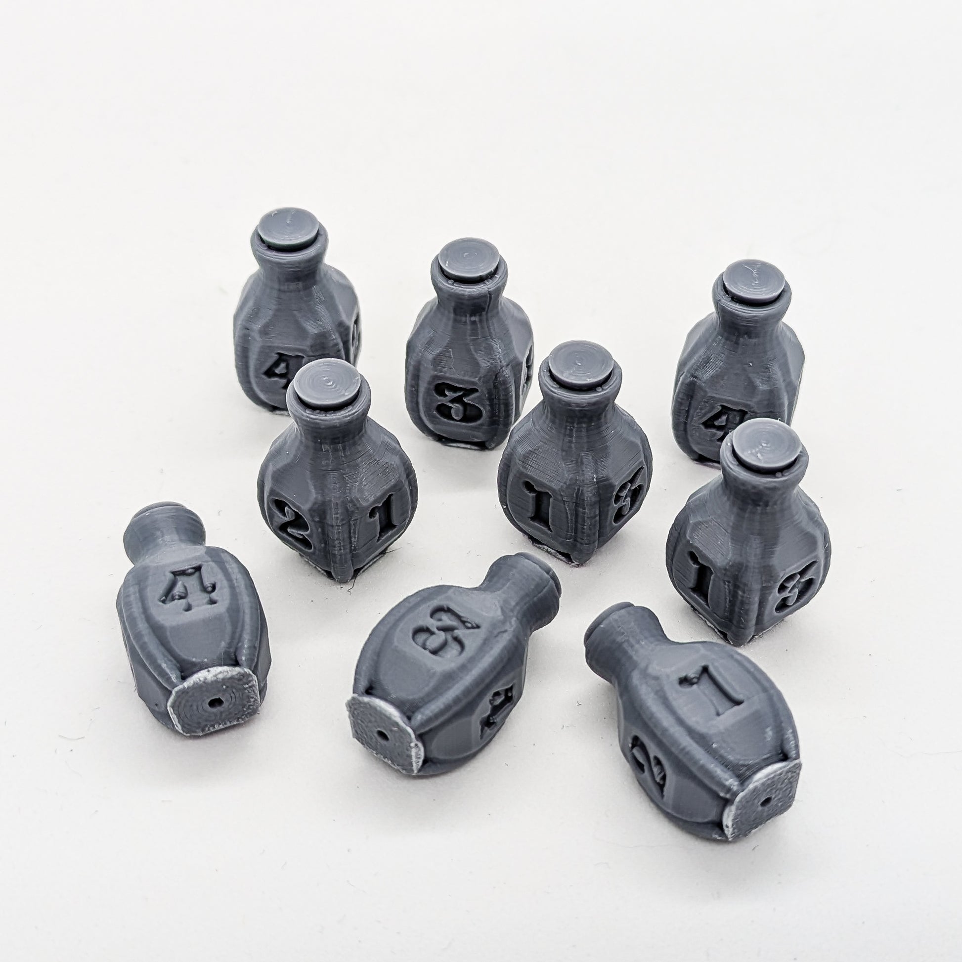 - 24 terningar forma som healing potions, nok til alle flaskene.
