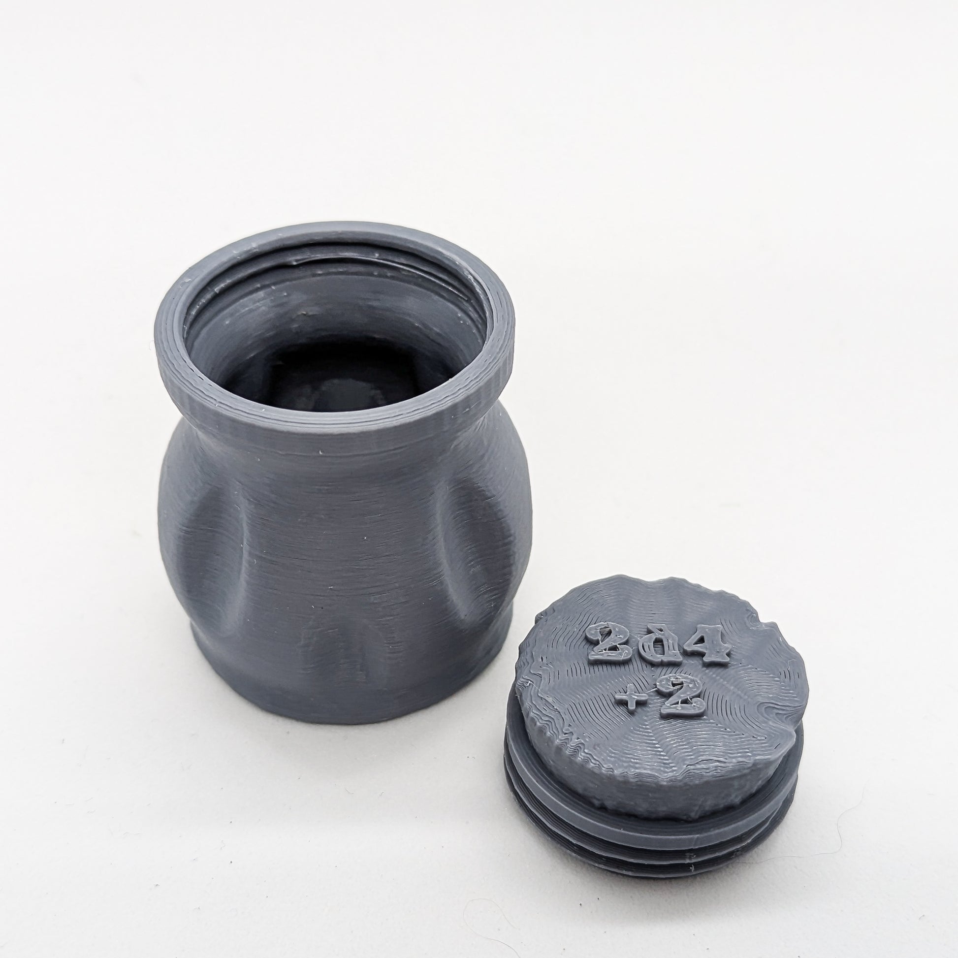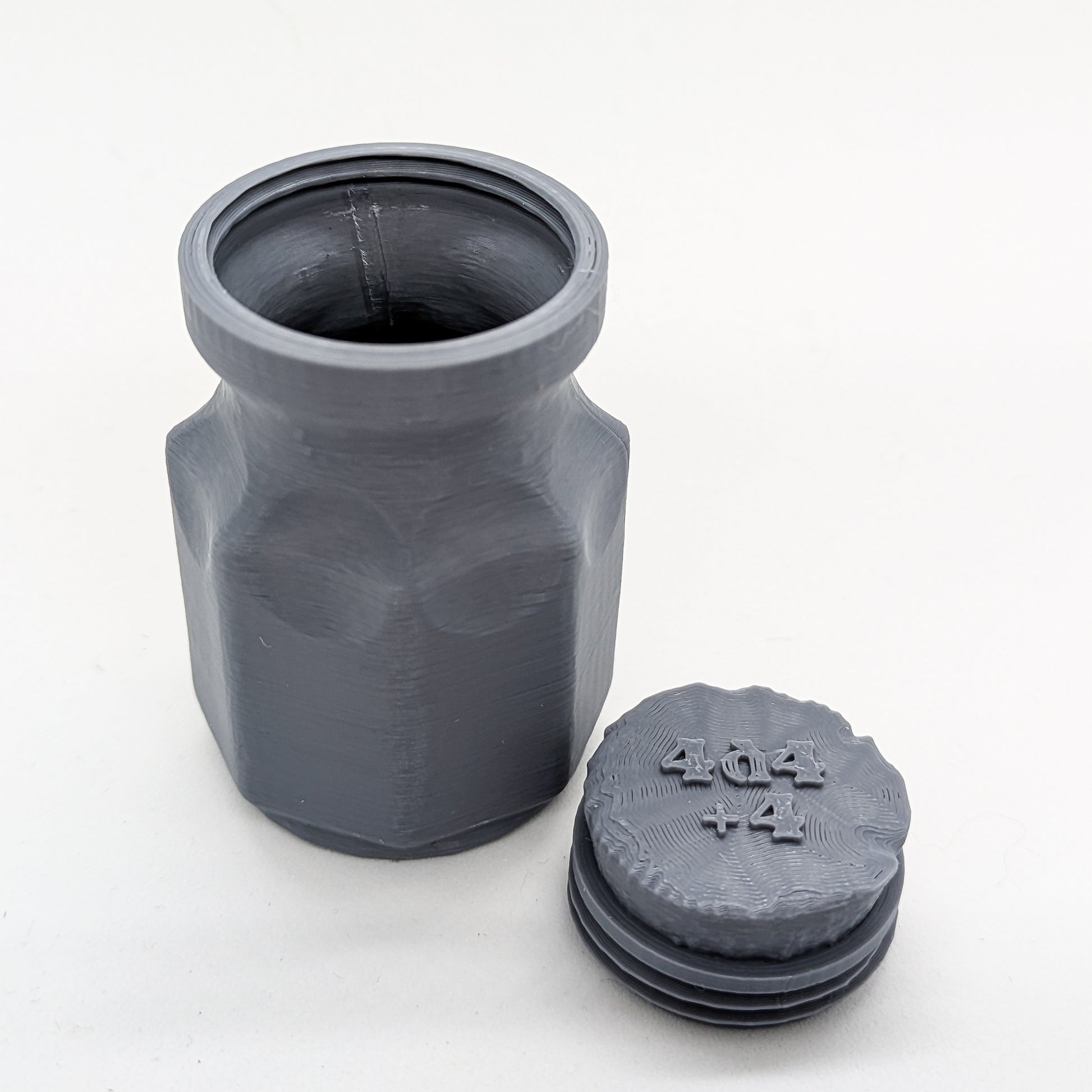 Kvar flaske kjem med ei skrukork med antallet terningar og antall helsepoeng den helbreder skrevt på.