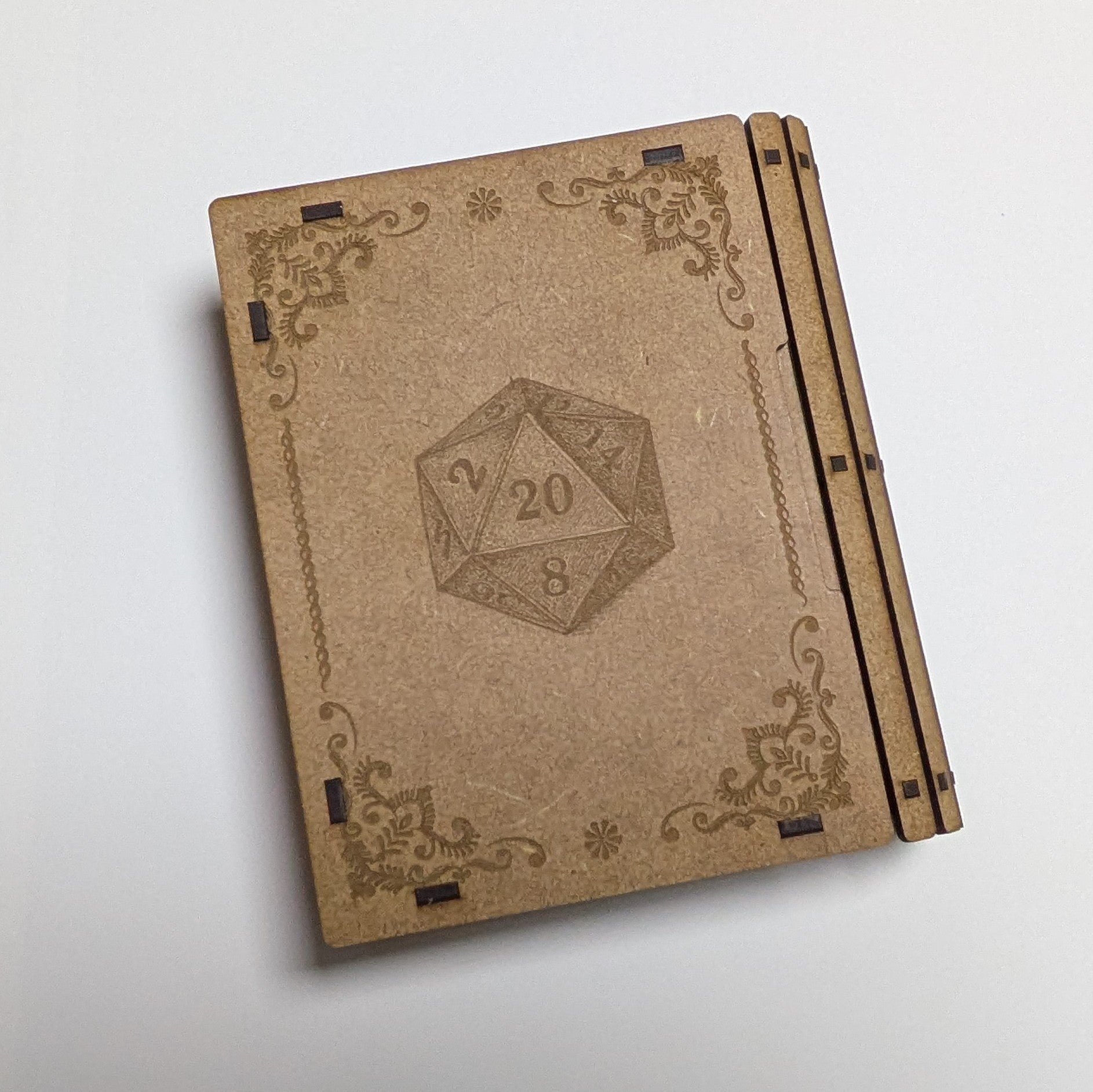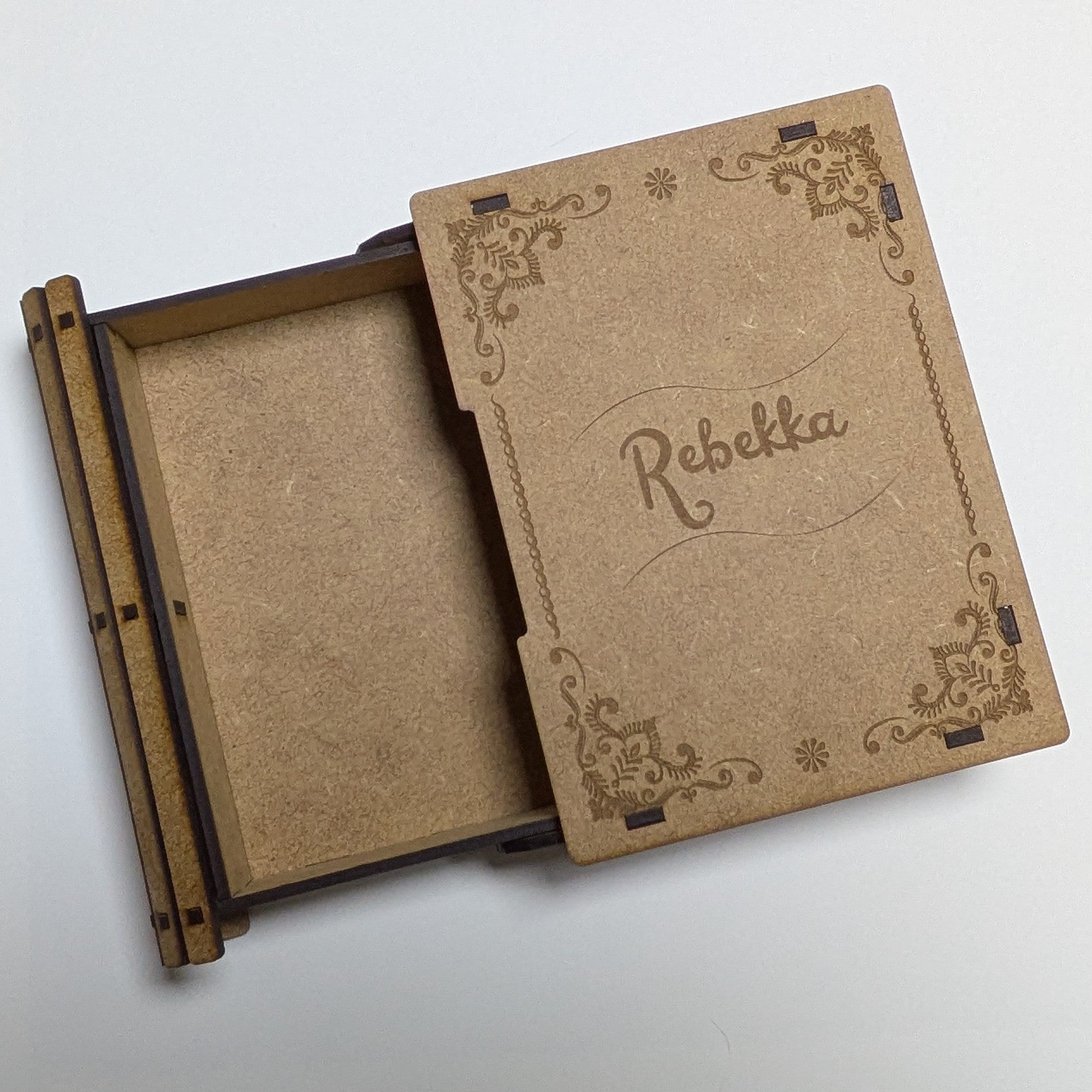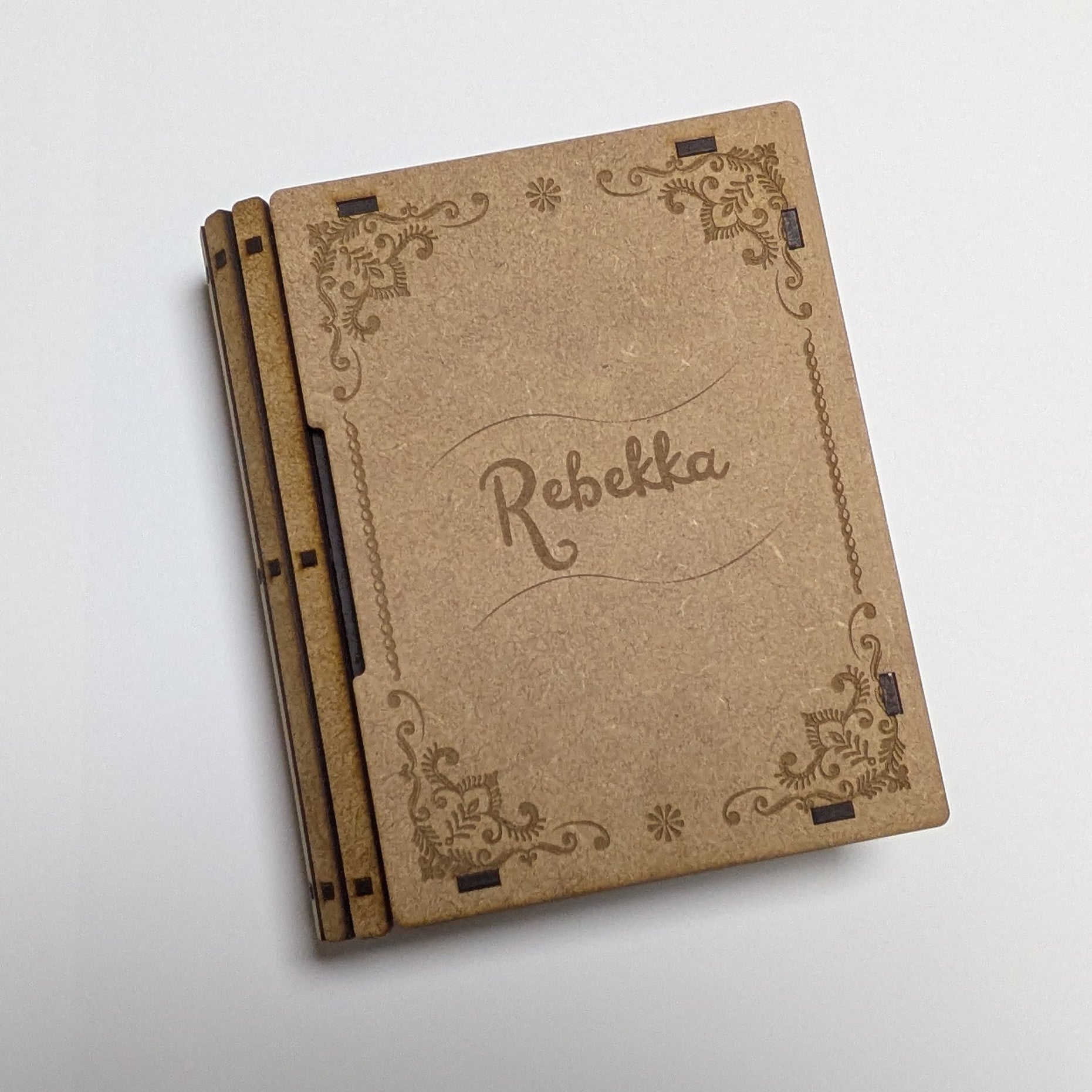 Denne boksa er laserkutta i form av ei bok, med ei lekker inngravert ramme på for- og bakside.