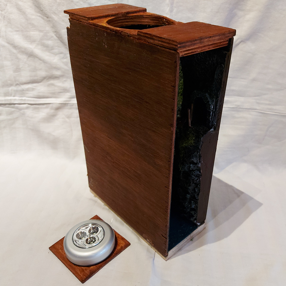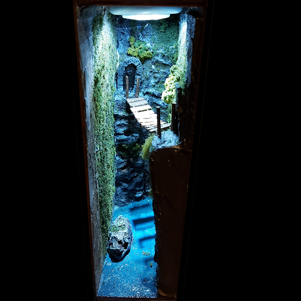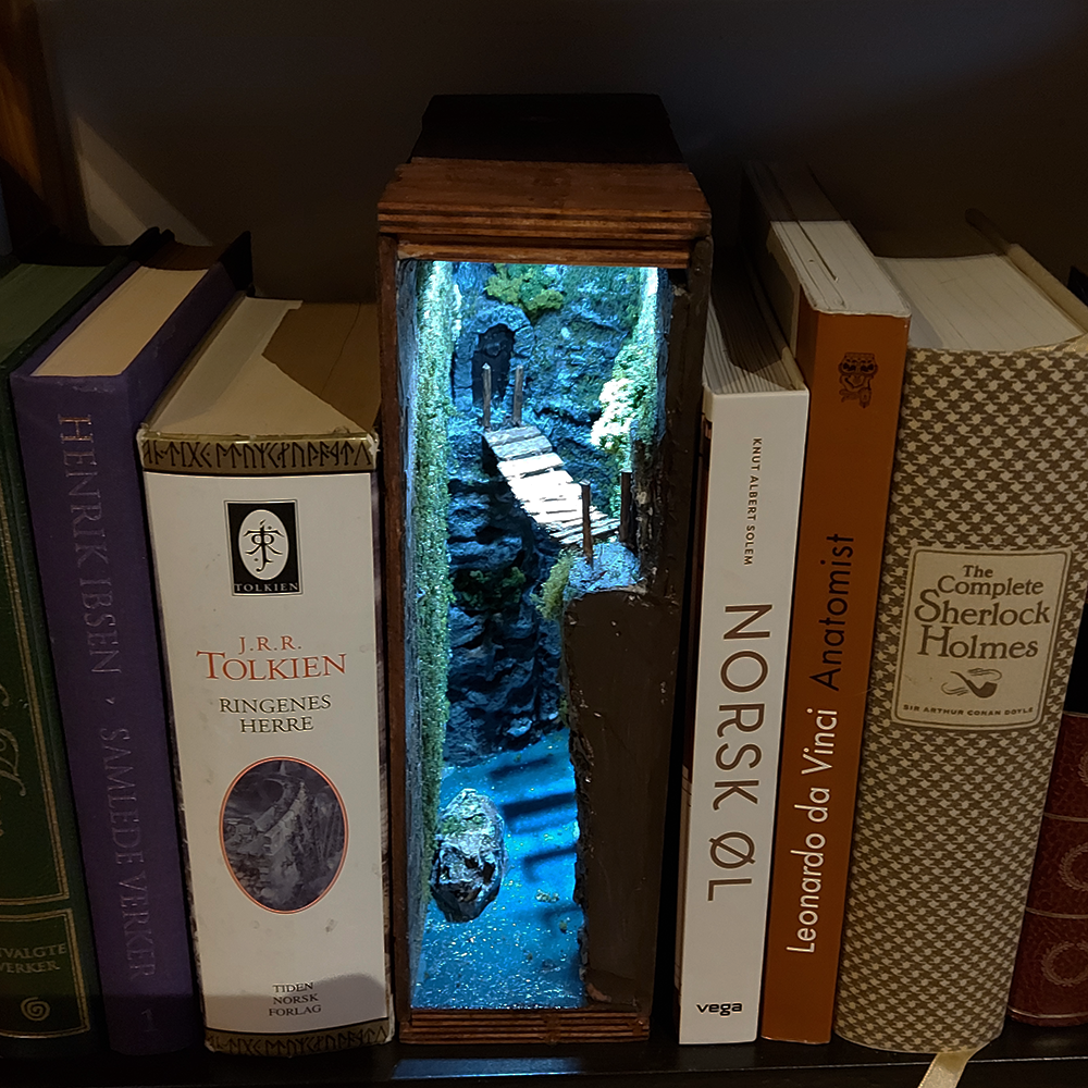 This book nook is made of wood, with recessed lighting above that can be taken off and on, to easily change both the battery and any lighting. Inside, it shows a deep and steep ravine, with moss and bushes growing out from the sides.