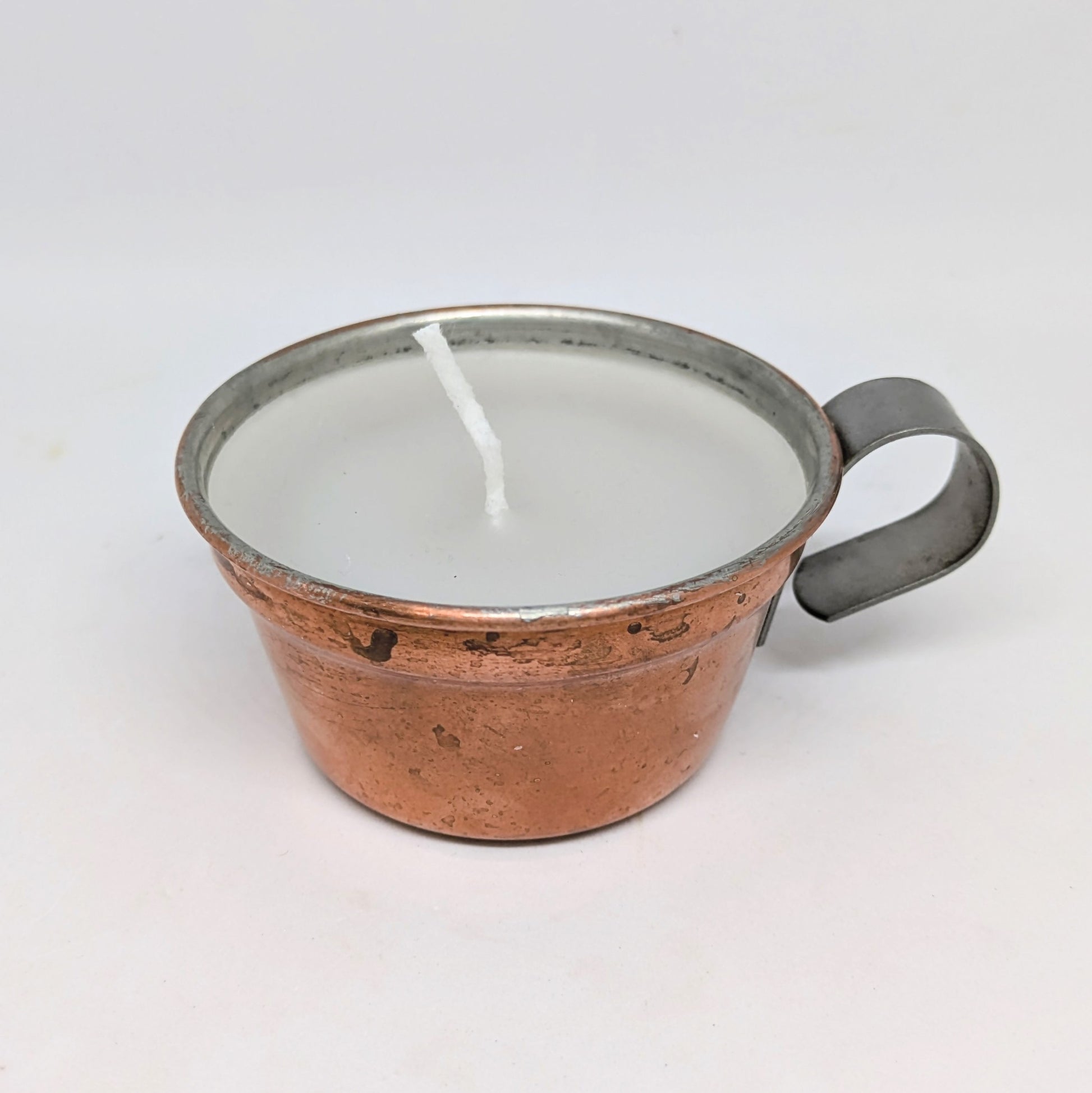 Lys støypt av lysrestar, med hint av jasminduft. Behaldar frå gjenbruksbutikk.