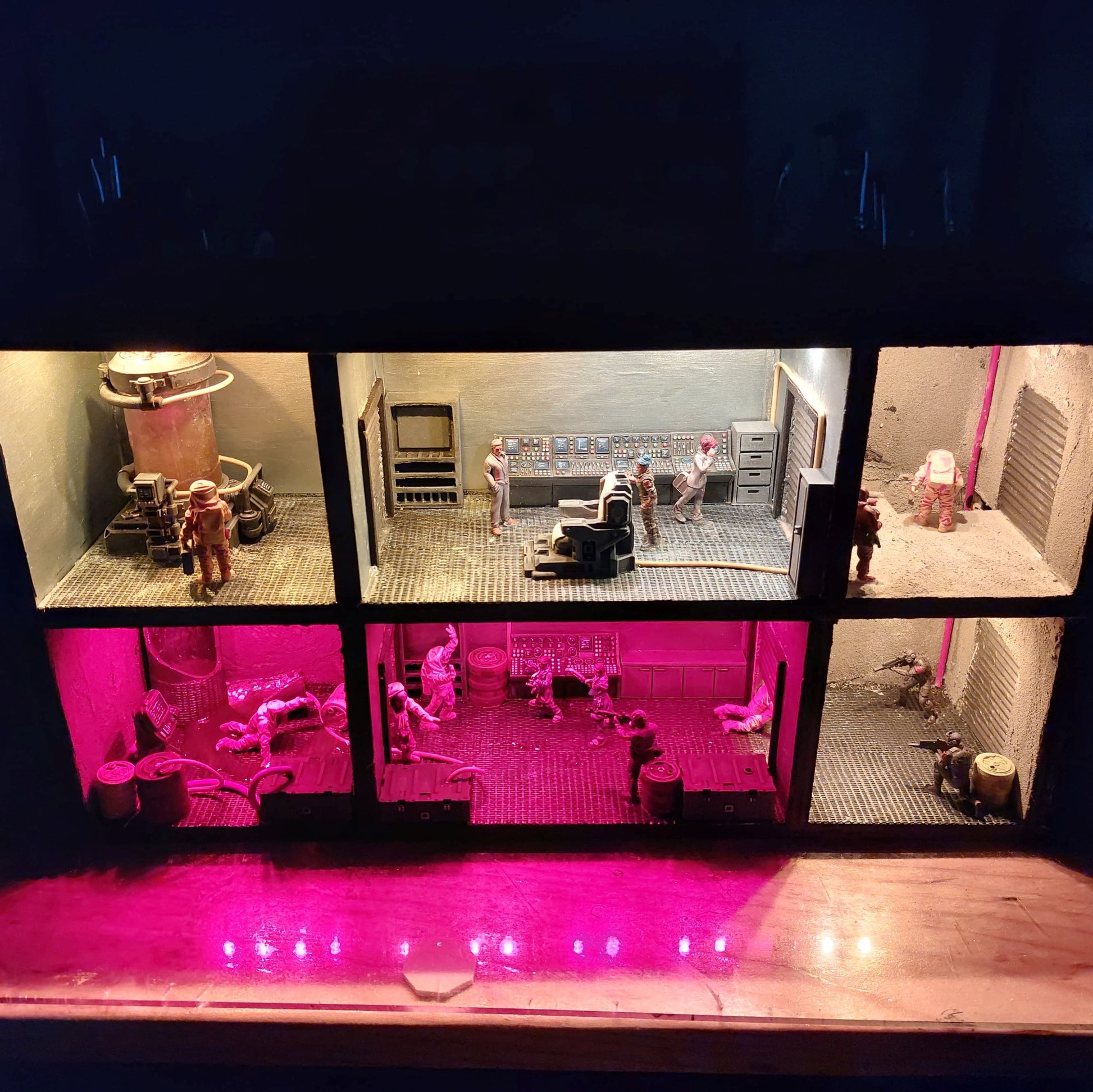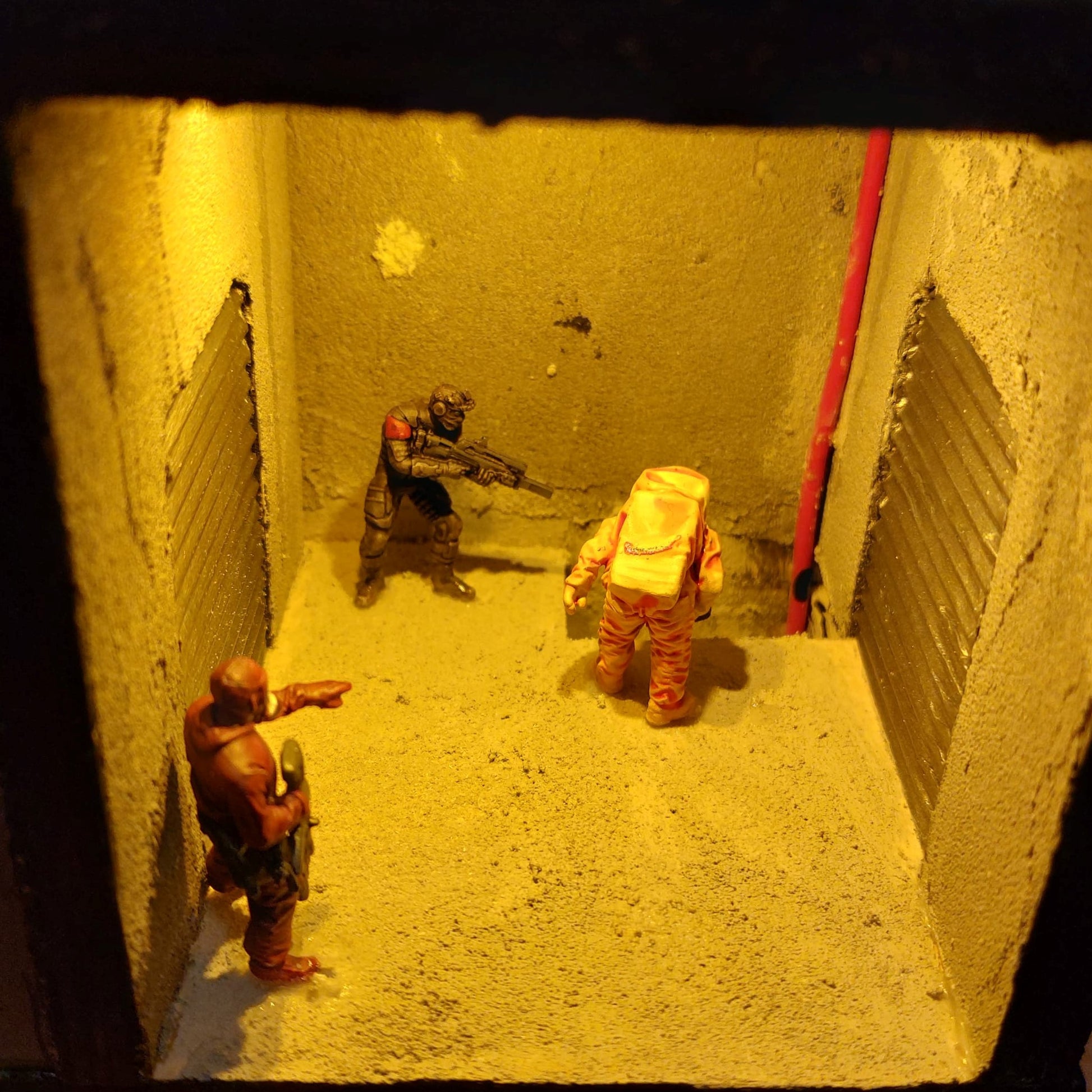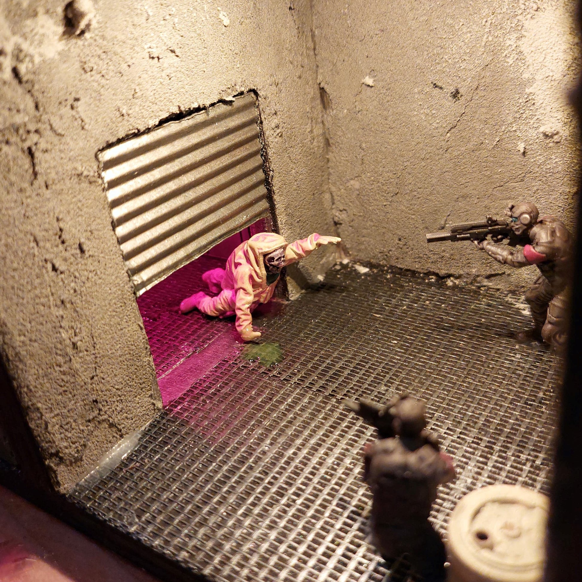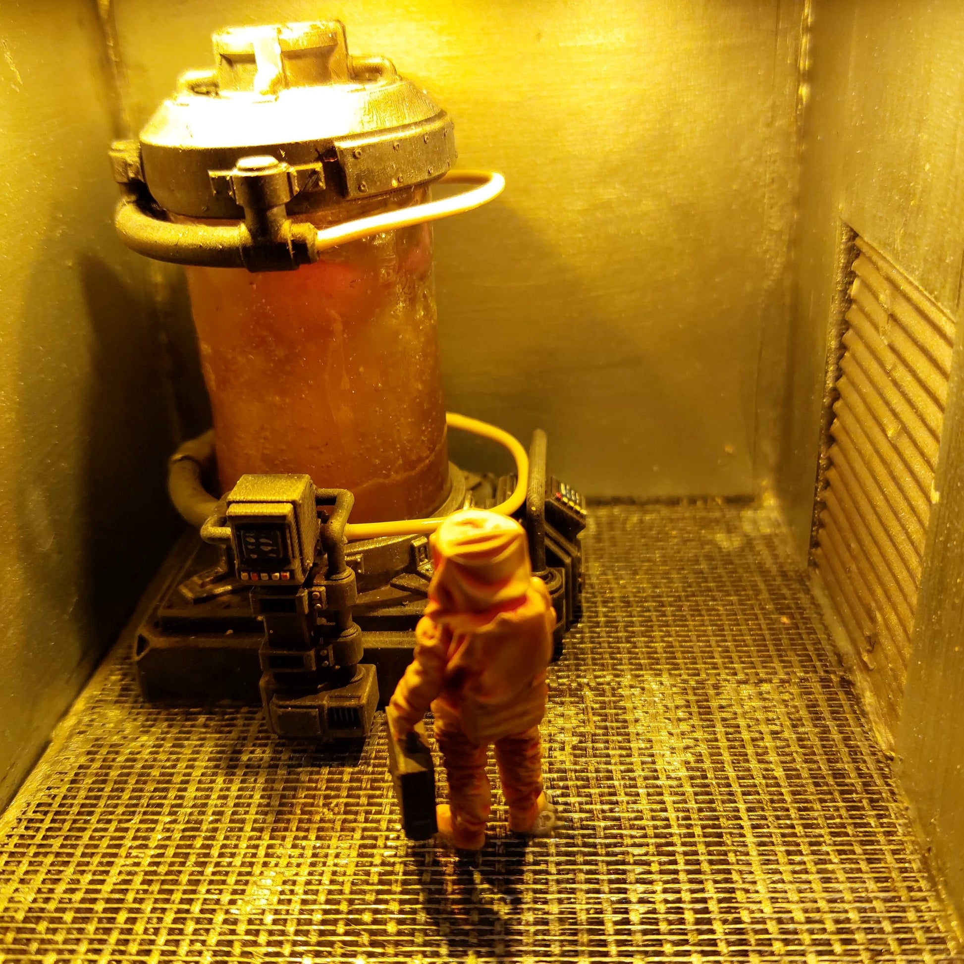 This bookshelf insert shows the inside of a laboratory, where a spill has occurred downstairs, and both guards and researchers have to fight for their lives. But on the second floor, the laboratory is still intact, and it can look like someone is trying to get something out. Who are these people in suits? And what is inside the tank at the bottom of the laboratory?