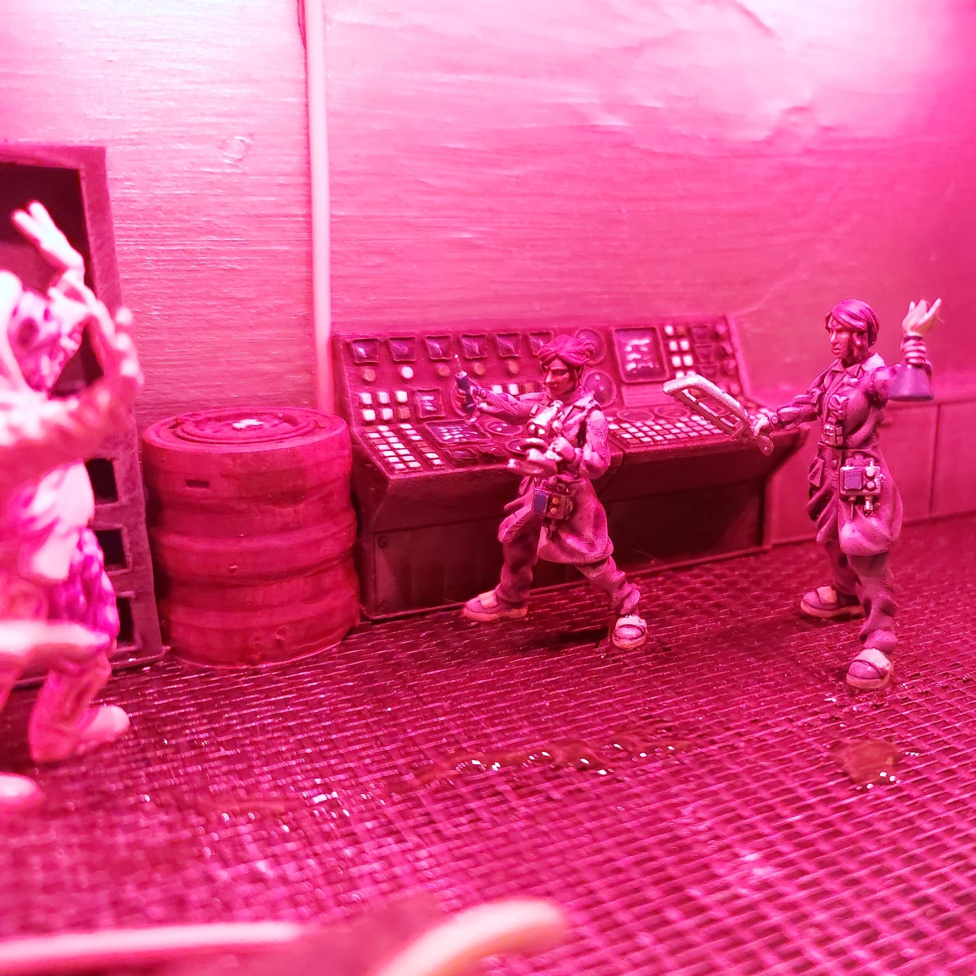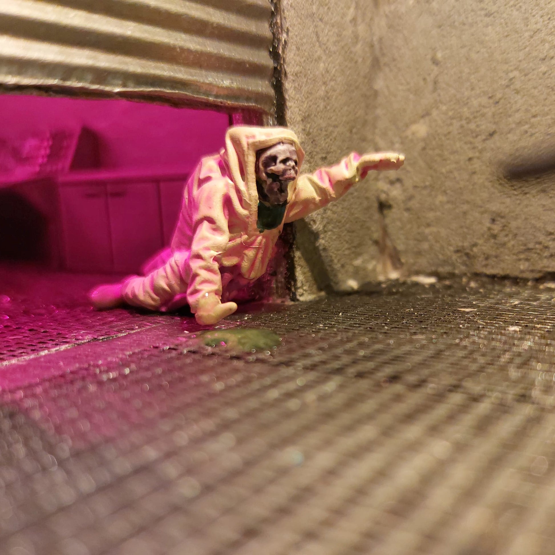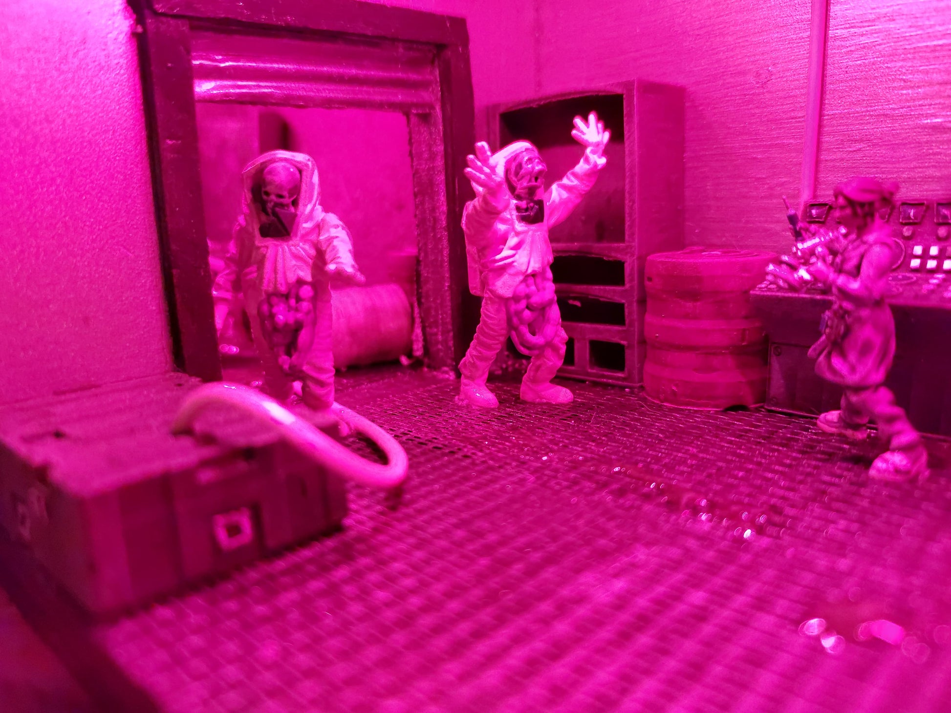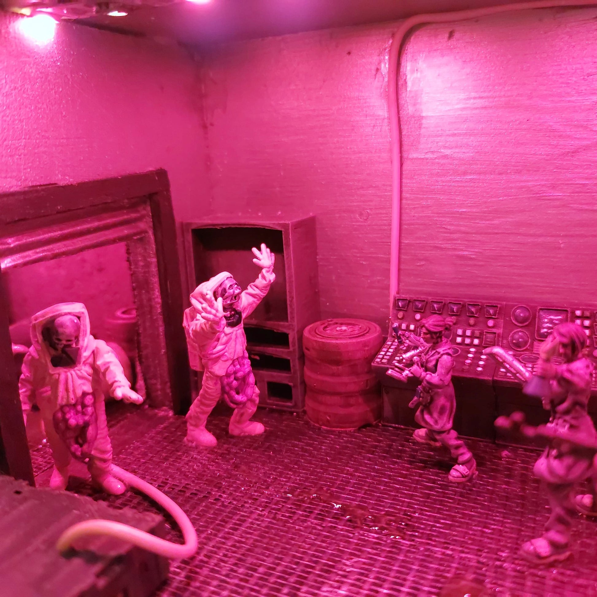 This bookshelf insert shows the inside of a laboratory, where a spill has occurred downstairs, and both guards and researchers have to fight for their lives. But on the second floor, the laboratory is still intact, and it can look like someone is trying to get something out. Who are these people in suits? And what is inside the tank at the bottom of the laboratory?