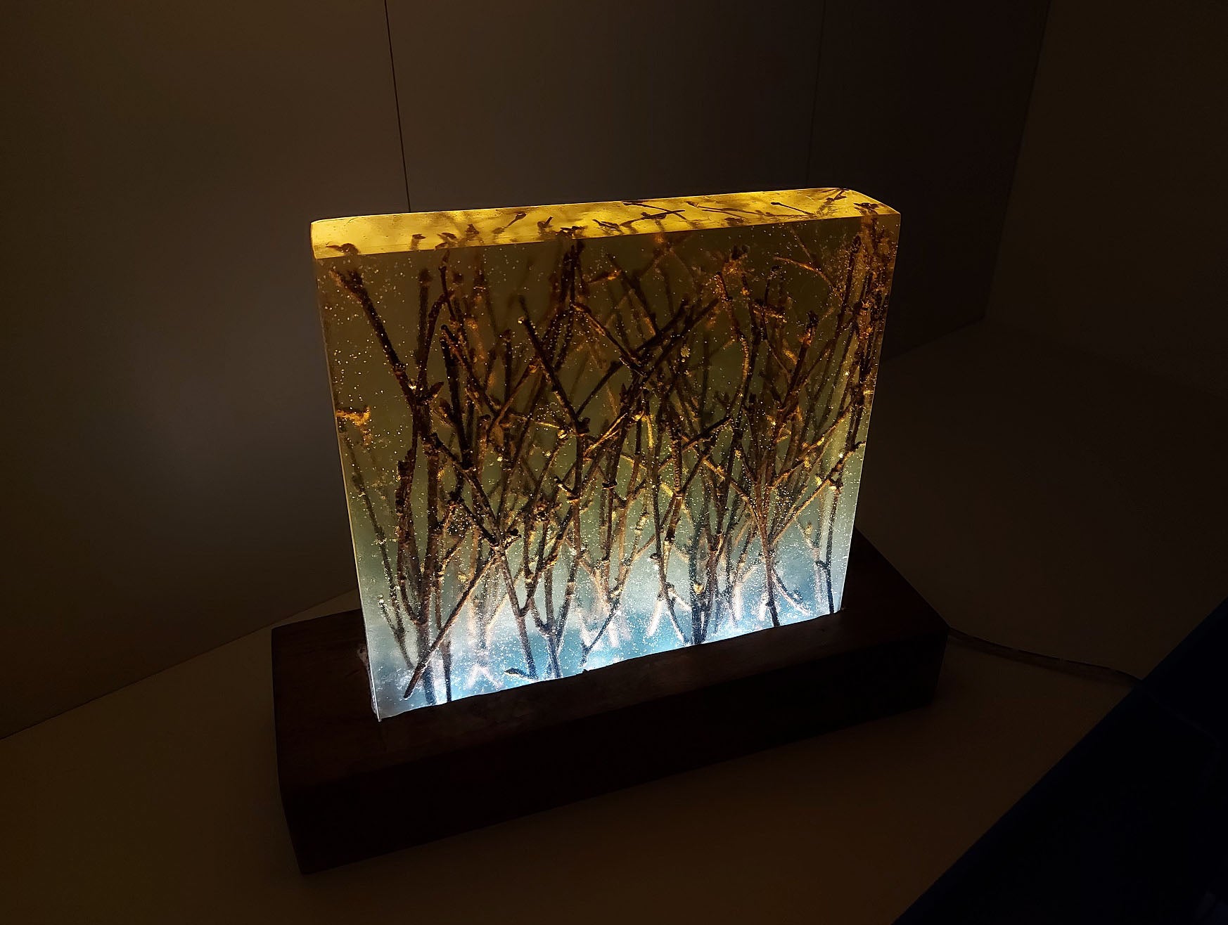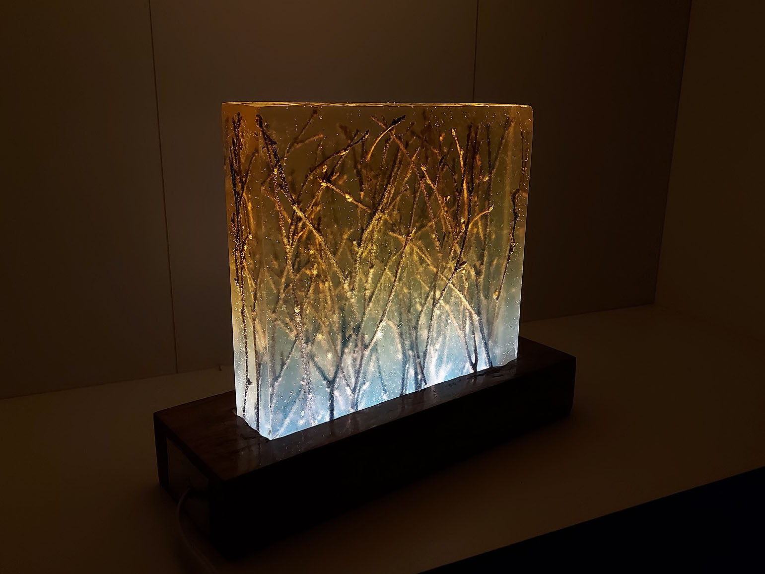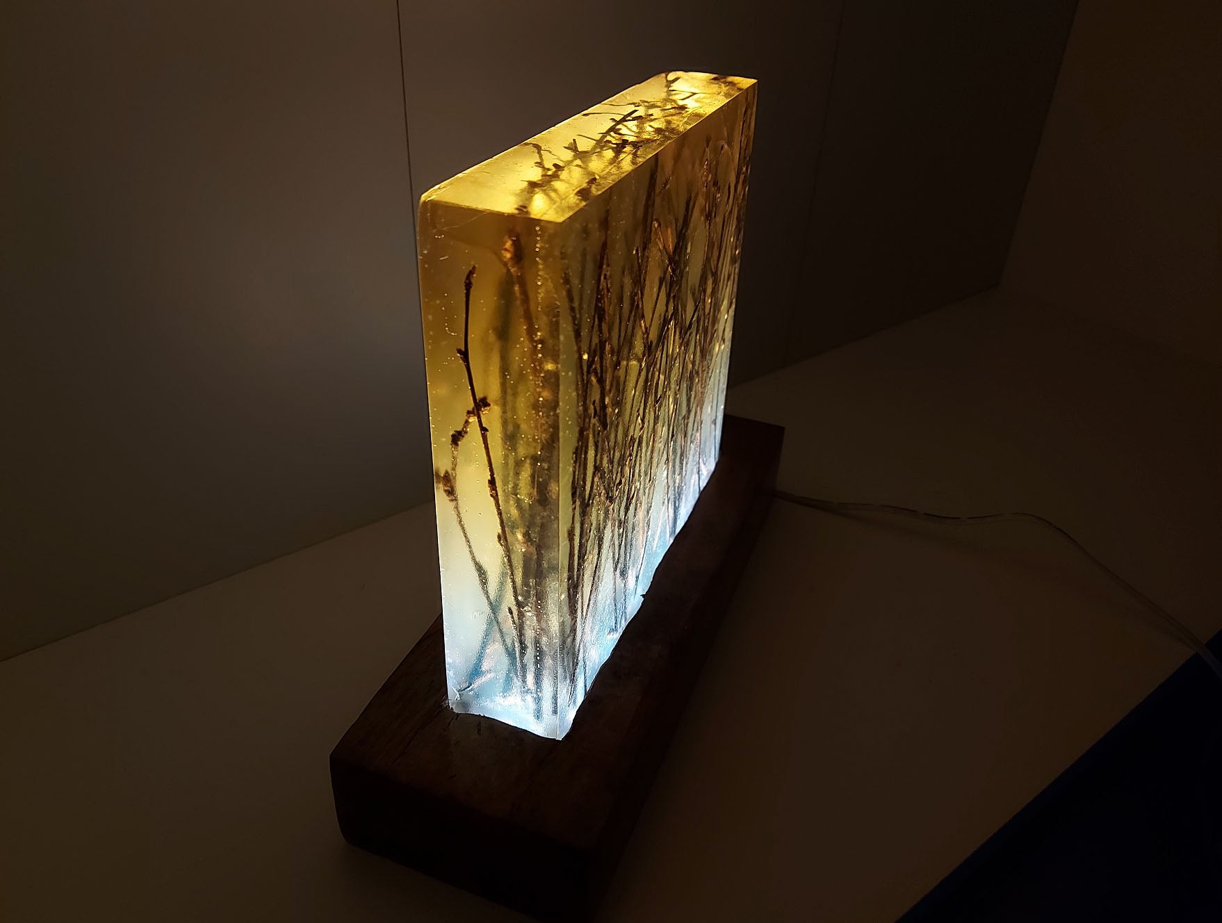 The lamp is illuminated with an LED strip in the wooden base. This is under the epoxy, and runs on current with a plug.