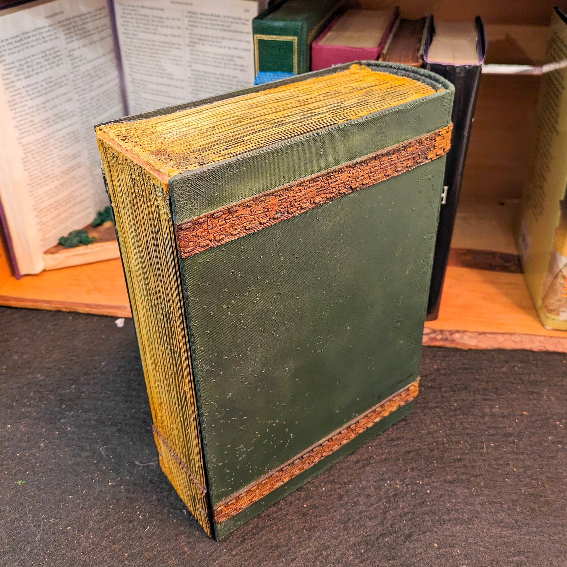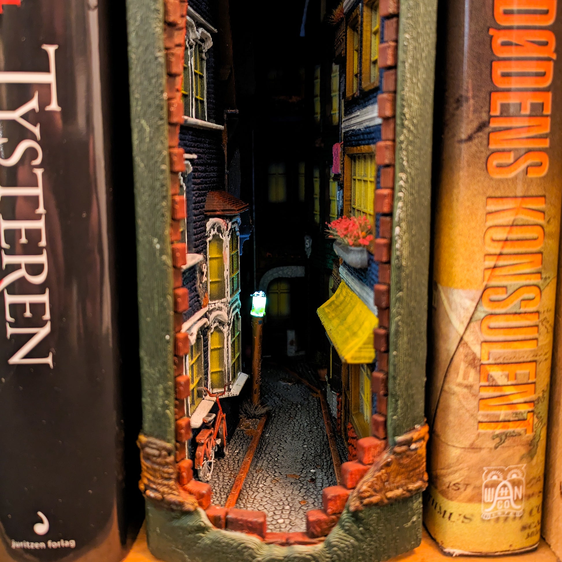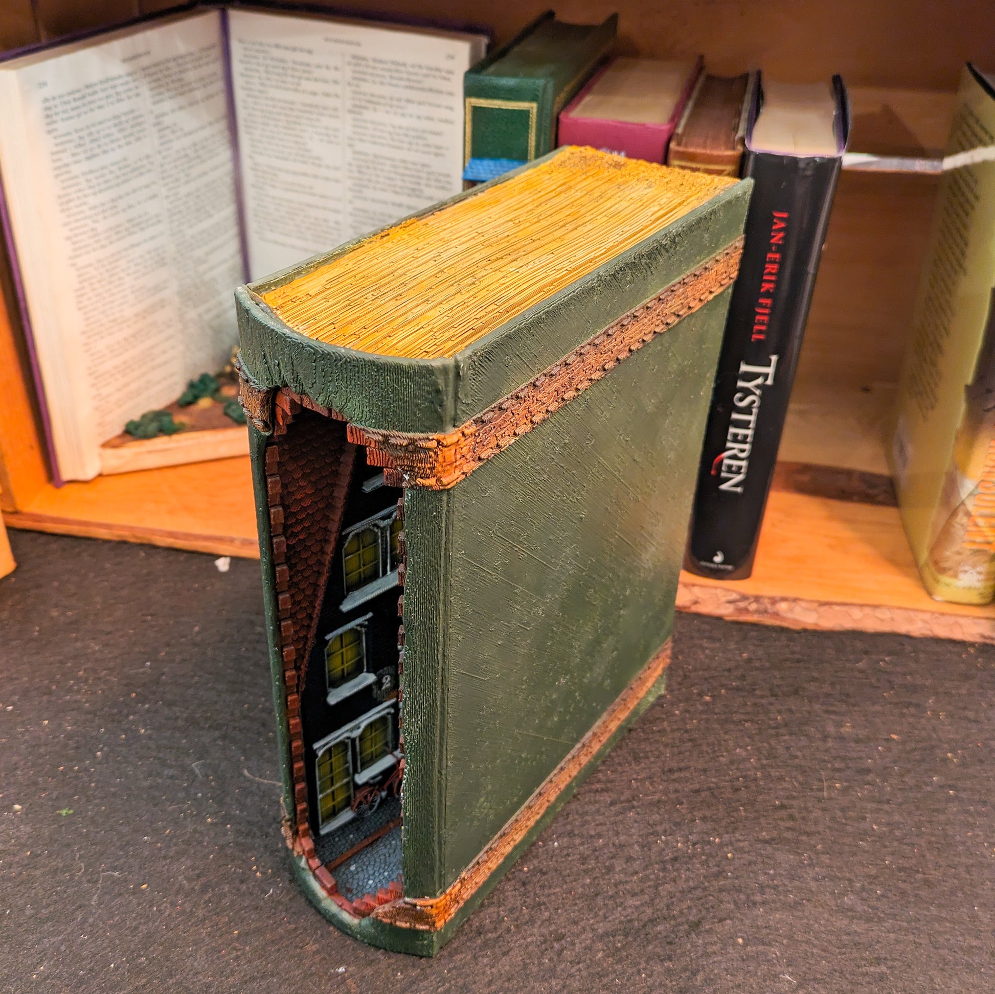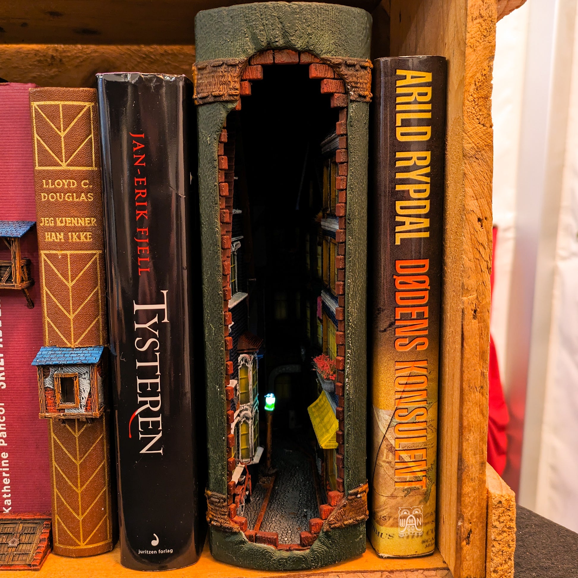 Denne boka er 3D printa, og har ei gatelykt dreven av eit lite batteri skjult bak i boka bak ei magnetisk luke. Slik kan du slå lyset av og på.