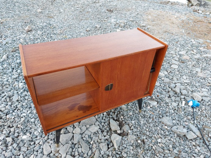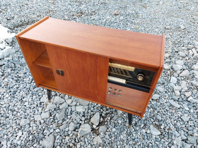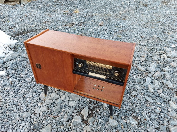 Newly refurbished old radio cabinet in teak. At one time, the cabinet had a radio in it, on the entire right side. I have taken this out, but put back the glass plate where you can see the frequencies and stations. This is illuminated with LED light, so you get the visual impression that the radio still works.
