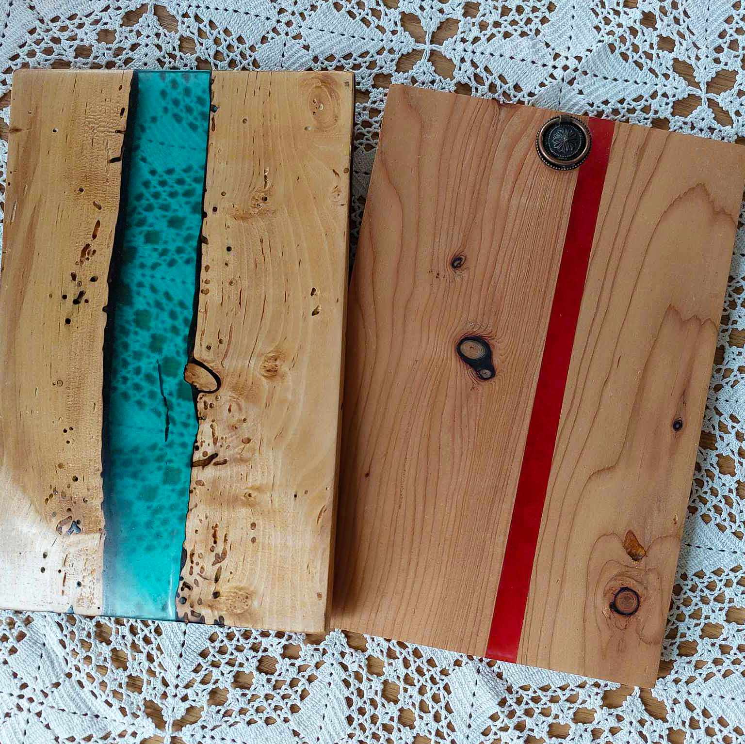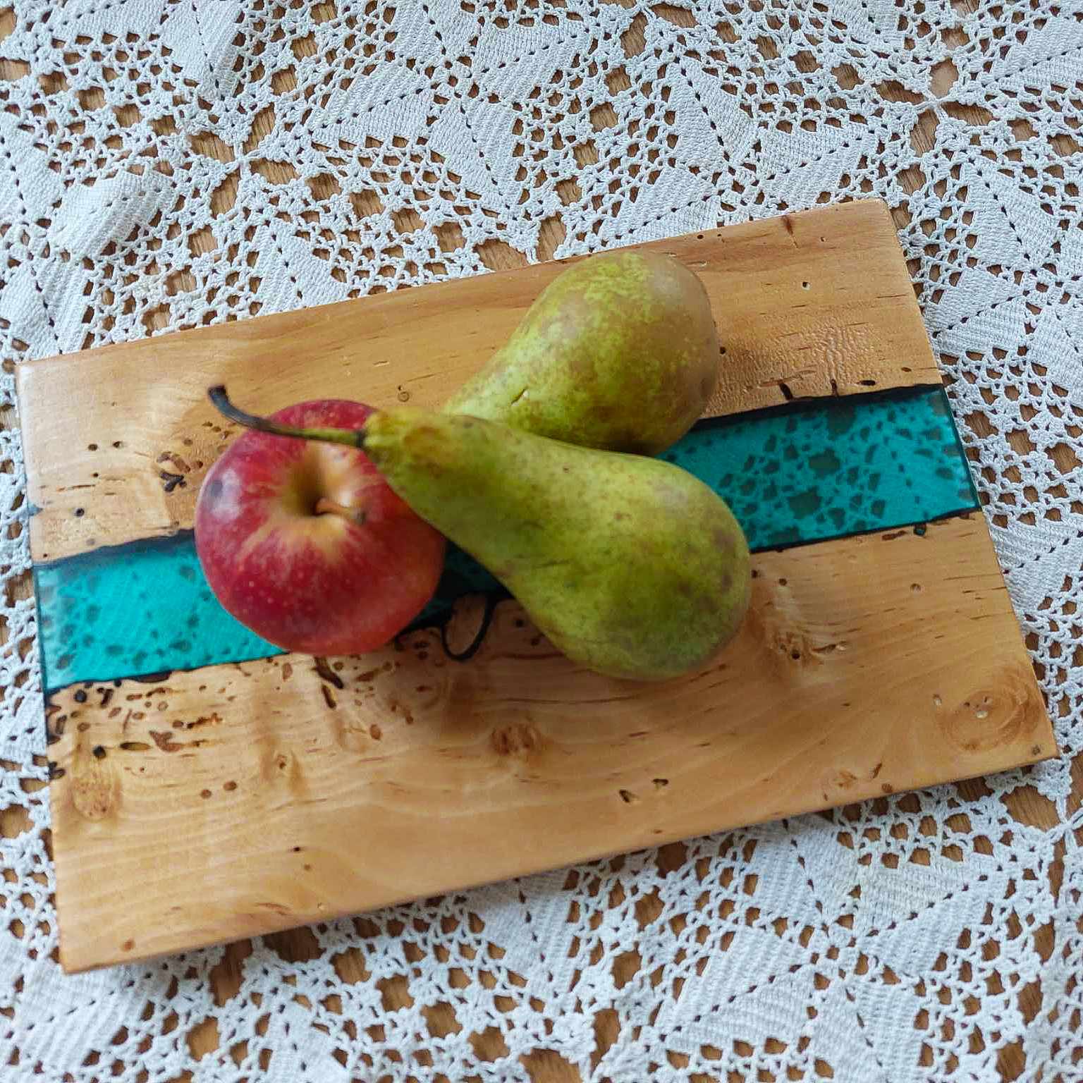Serveringsbrett i bjørk og epoxy. Dette fungerer like så godt på stua med pynt som på kjøkkenet med mat.