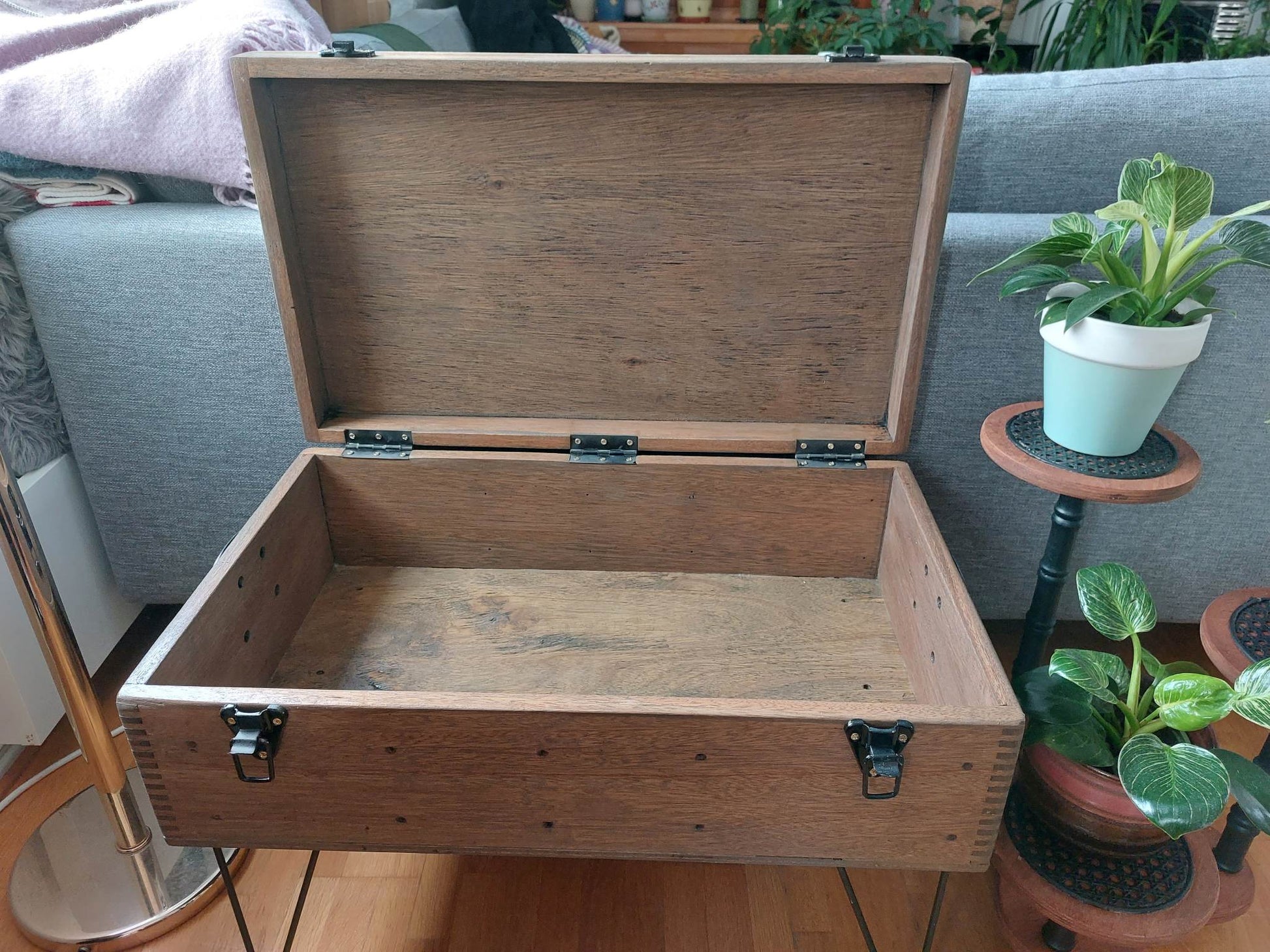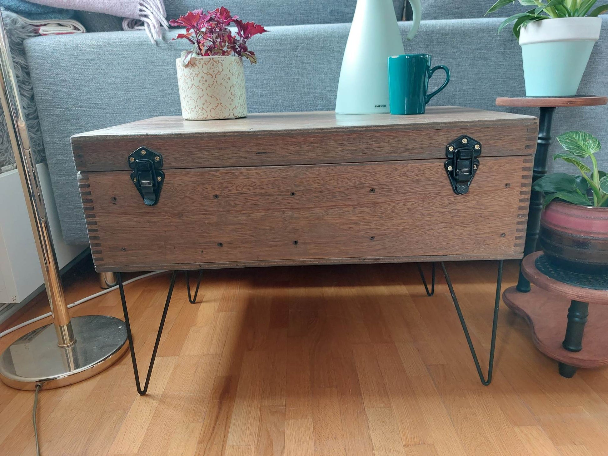 Her har eg pussa opp ei gammal trekiste eg fann på eit loft. Usikker på alder på sjølve kista, men alle delar er originale, berre pussa ned og lakka. Dette gjeld alle hengsler og handtak.
