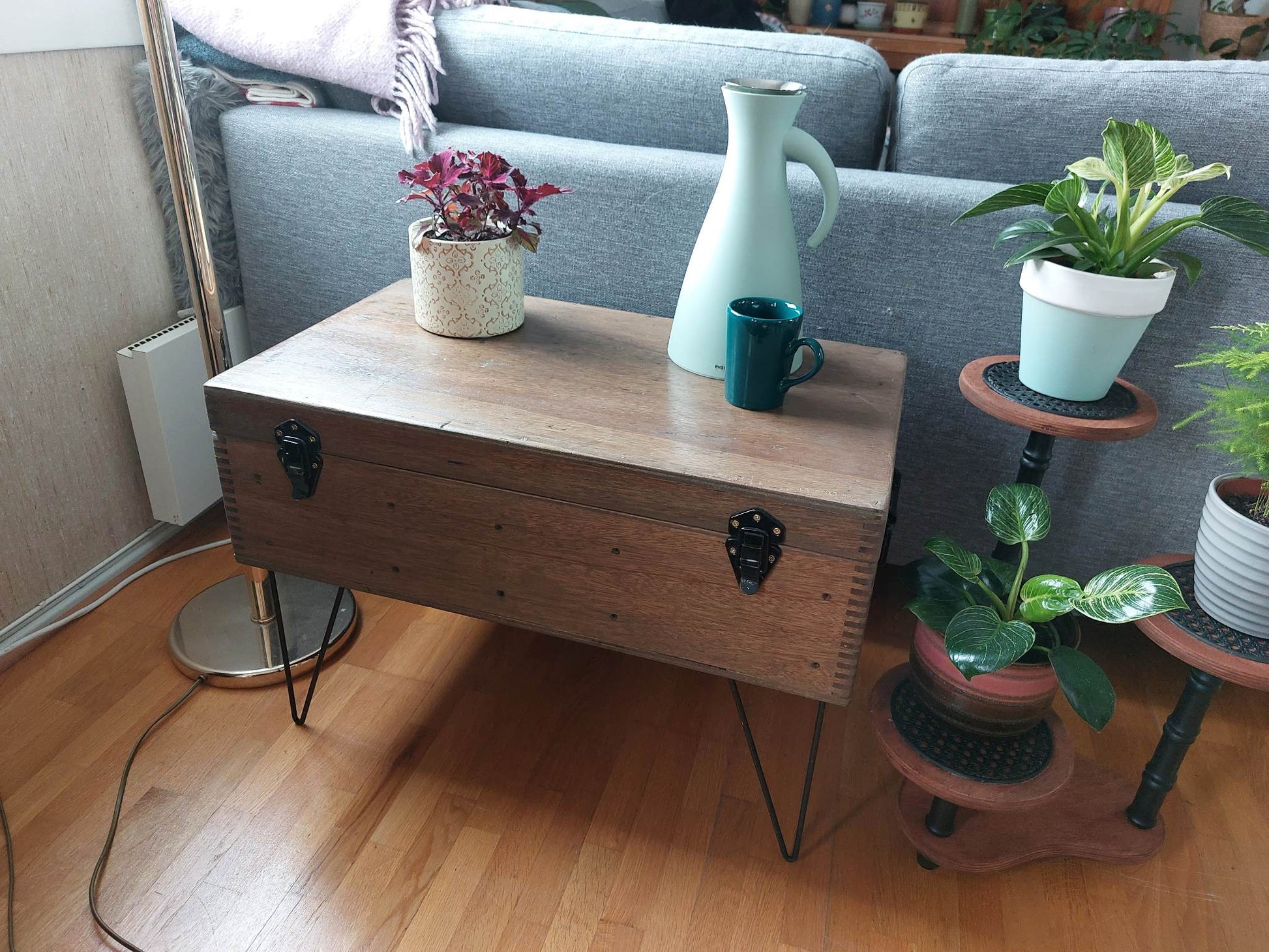 Den er satt på kort bein, og passer perfekt som eit lite sofabord, eller eit endebord.