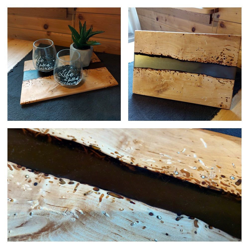 This board can be used for serving or decoration. This is handmade by me, from birch felled, sawn and dried here in Gjerdsbakkane. Wood was once sawn at our old saw which stood here earlier. It also has a "living edge", where the inside of the birch against the epoxy is from the outside of the tree trunk, so you get a nice flow through with a nice dark edge in the wood against the epoxy.
