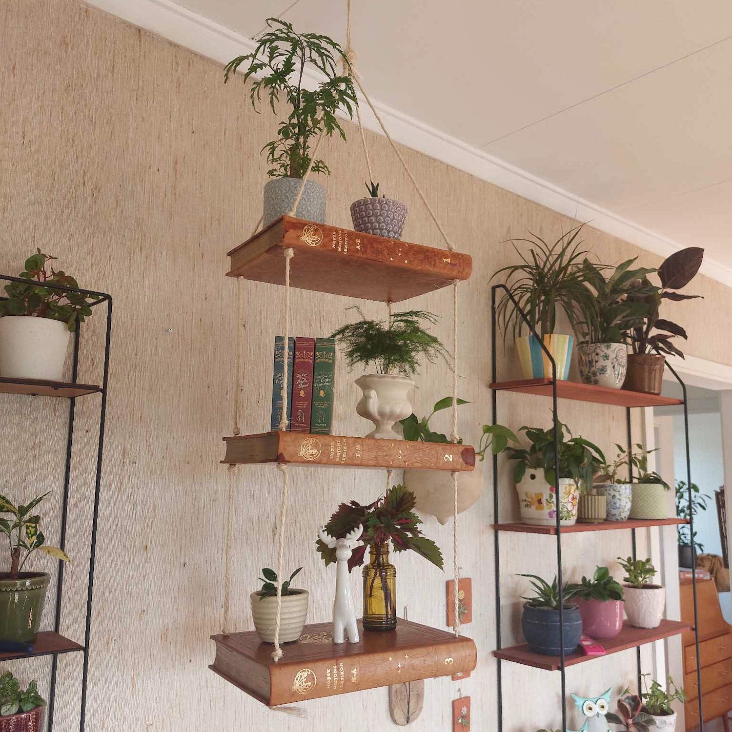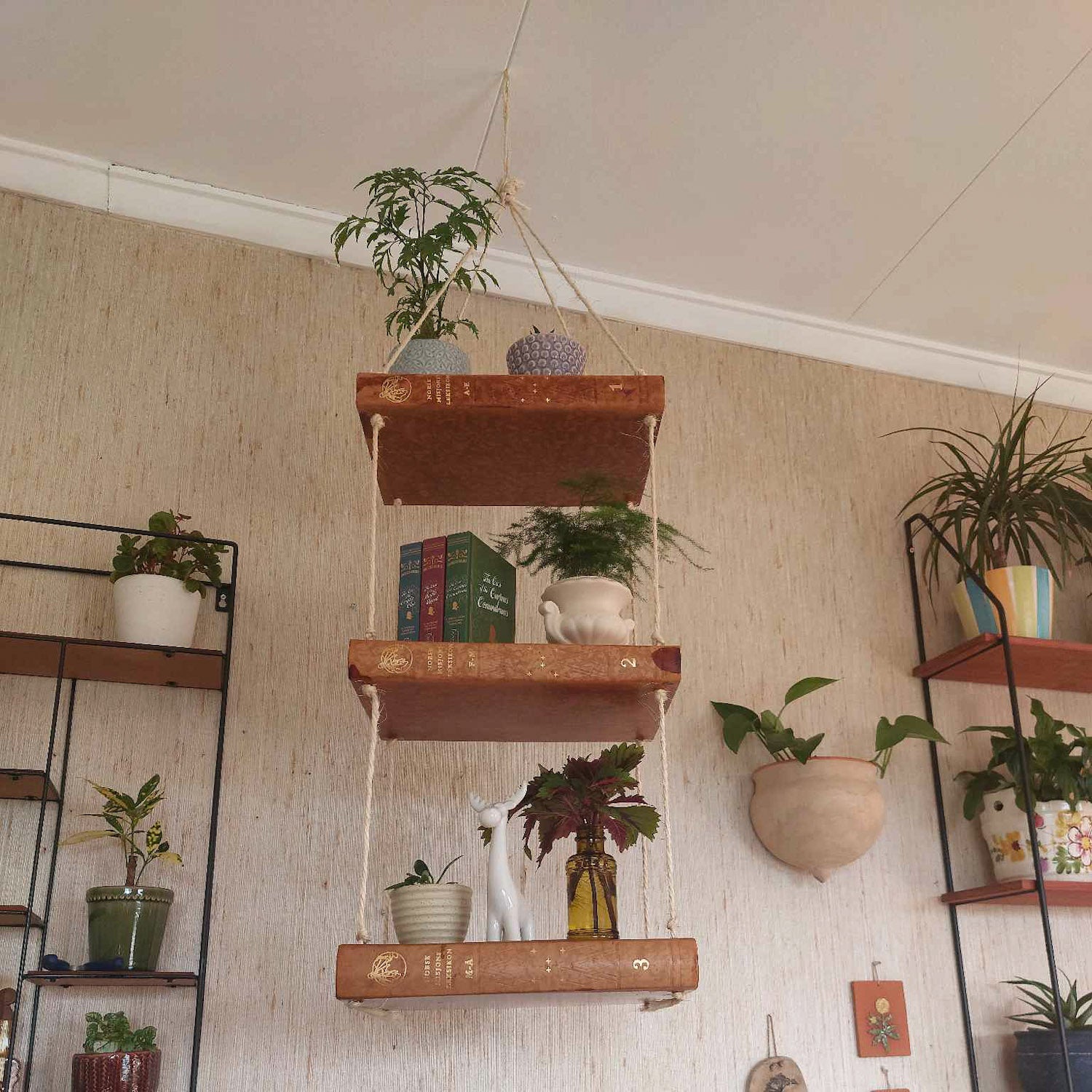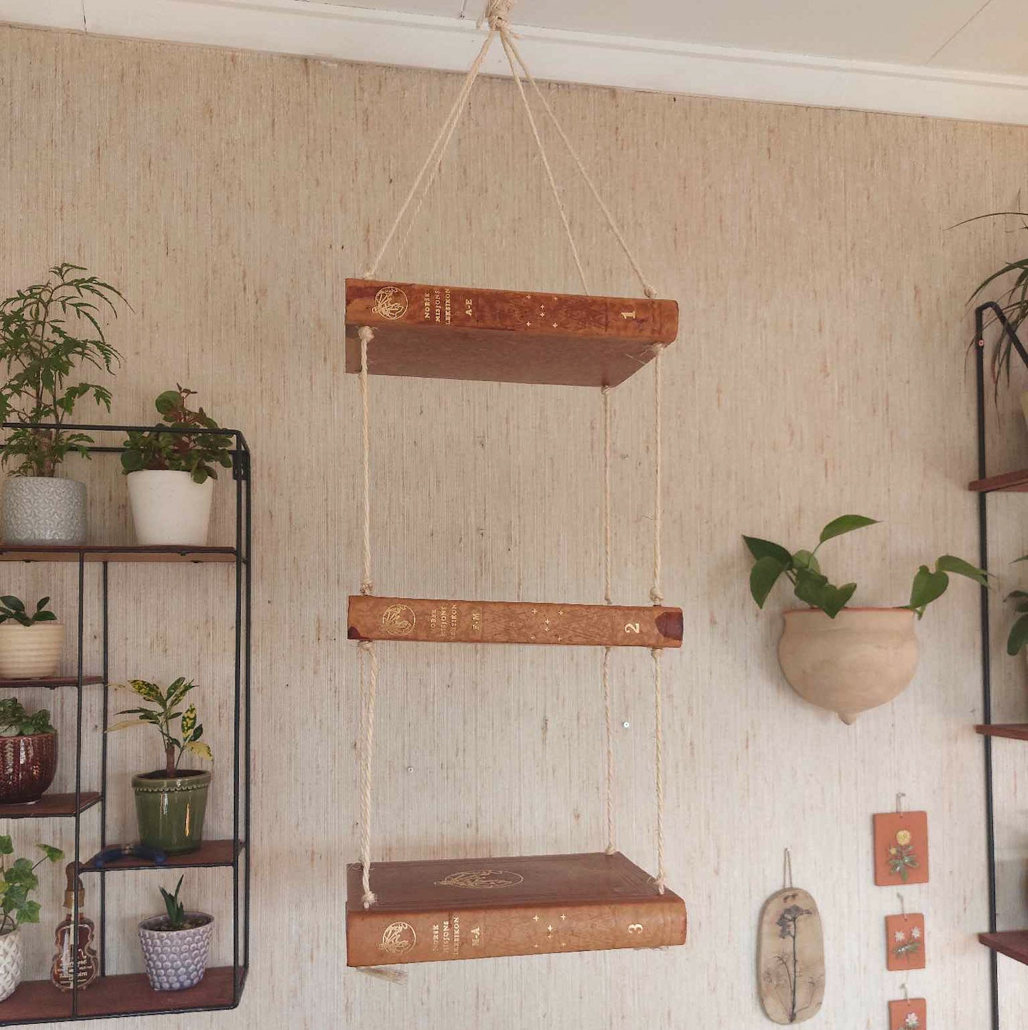 Her får du ei enkel, hengande hylle laga av gamle bøker med skinninnbinding. Den gir eit rom, eller eit hjørne, det vesle ekstra som verkeleg viser fram både det du set på hylla, men også din kjærleik til bøker og gjenbruk.