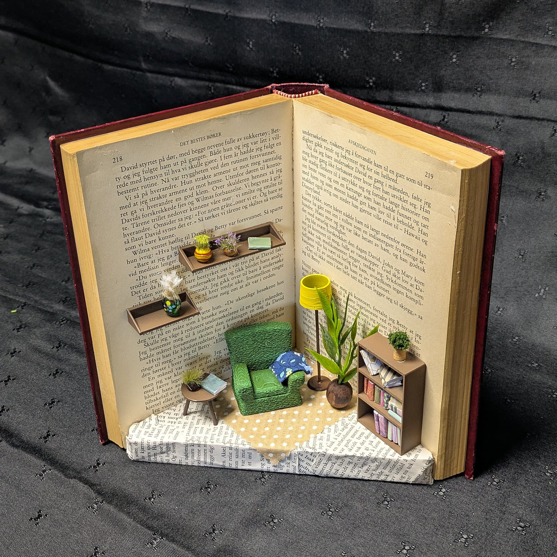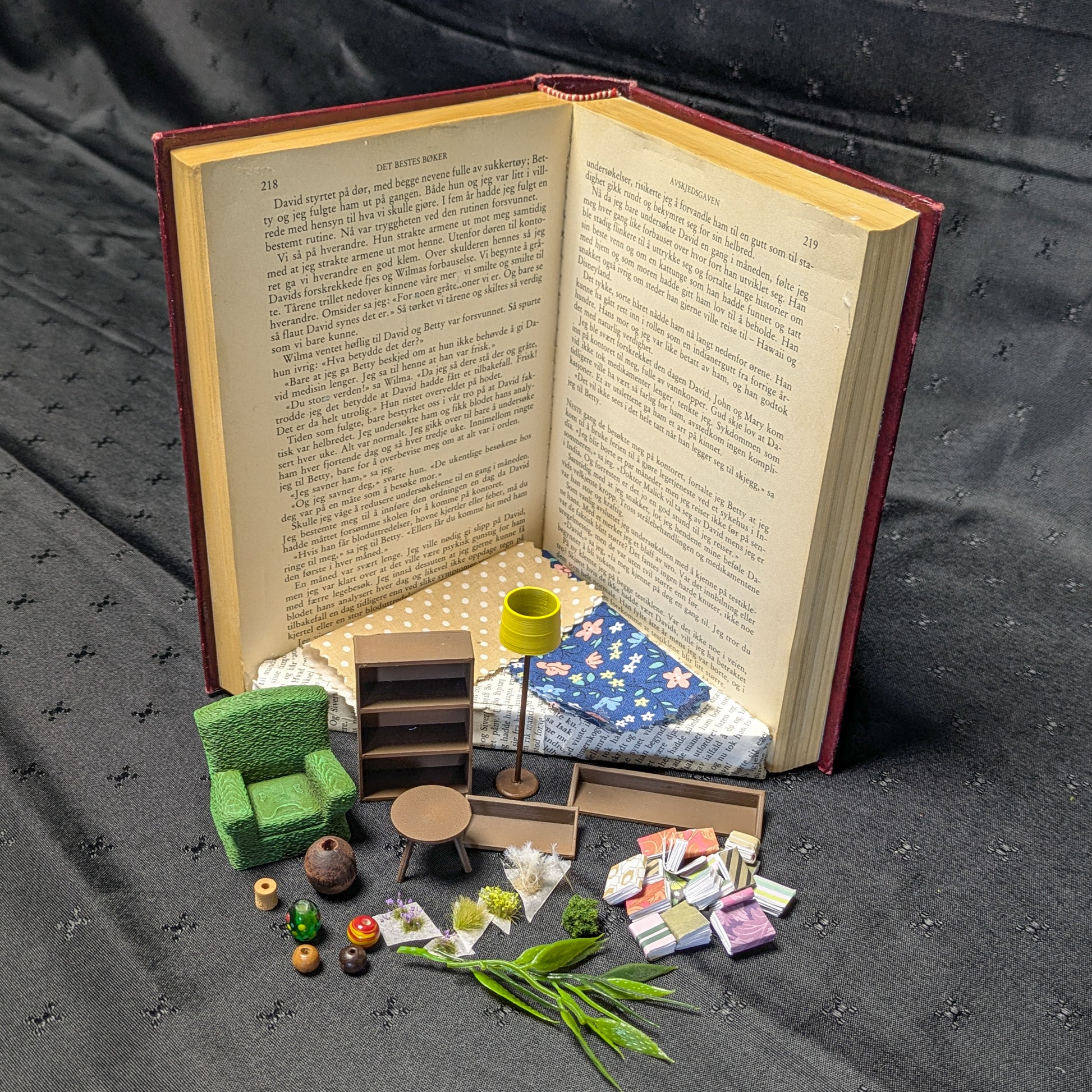 Skap noko heilt unikt med dette kreative DIY-settet for å lage di eiga bokstøtte! Her får du alt du treng for å bygge ei stemningsfull lita verd inni ei bok – komplett med blant anna miniatyrmøblar, planter, stoff og hylleplater. Du bidreg sjølv med lim og ei bok du ikkje lenger brukar.