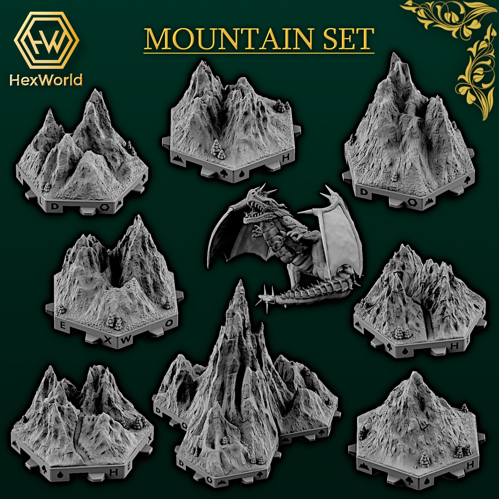 9 brikker til å representere fjell. Her får du også en drage som ruver over fjelltoppene.