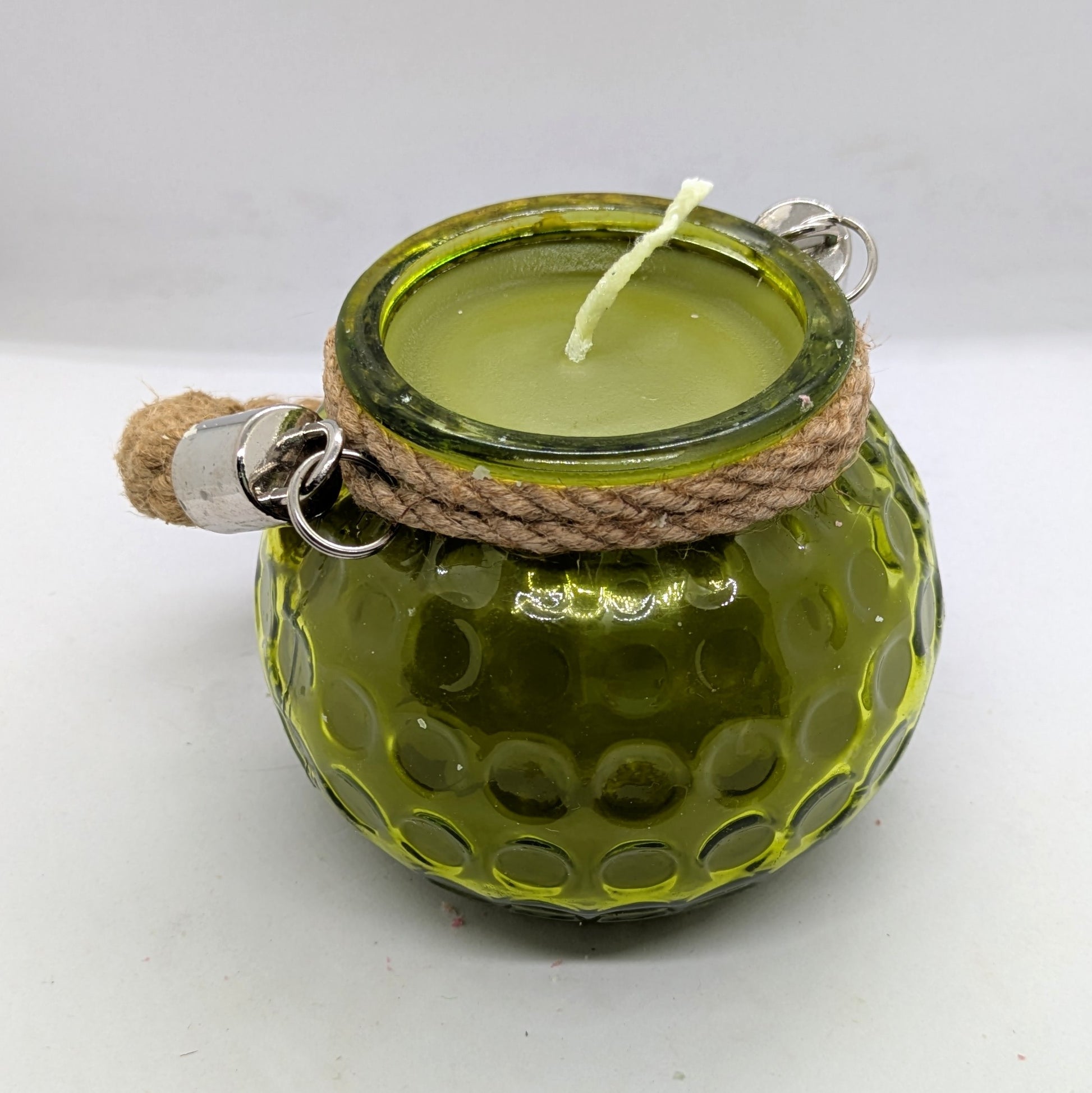 Lys støypt av lysrestar, med duft av jasmin. Behaldar frå bruktbutikk.