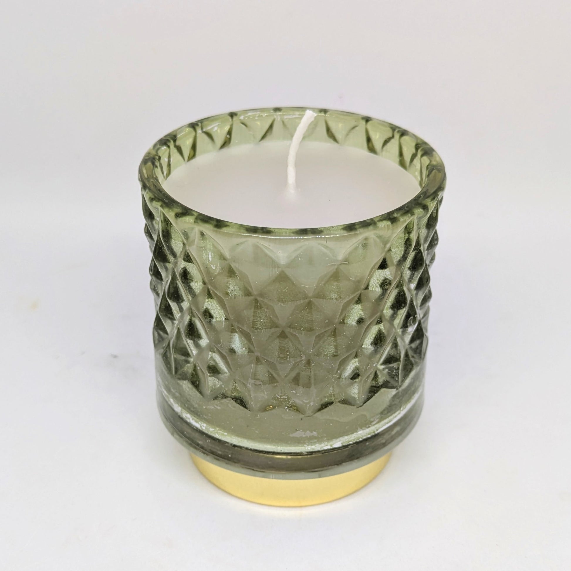 Lys støypt av lysrestar, med hint av jasminduft. Behaldar frå gjenbruksbutikk.