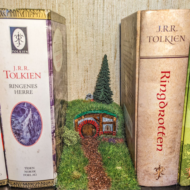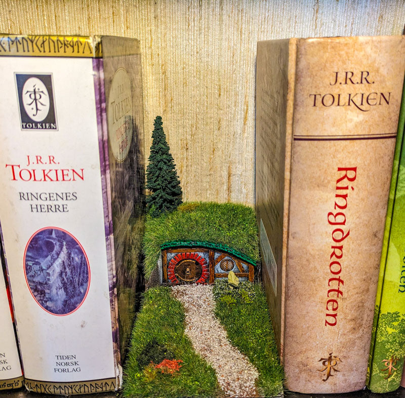 Sitert frå "ditut og attende", den nynorske omsetninga av hobbiten. Og her får du di eiga hobbithole å sette i stova, anten i ei krok, blant plantane eller i bokhylla.