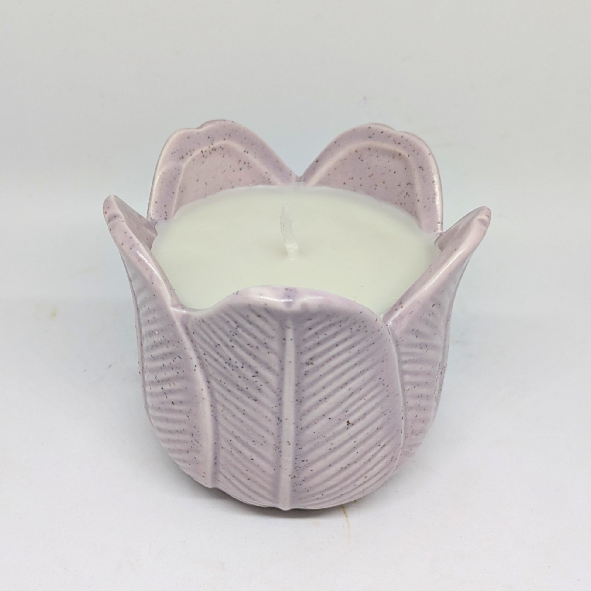 Lys støypt av lysrestar, med hint av jasminduft. Behaldar frå gjenbruksbutikk.