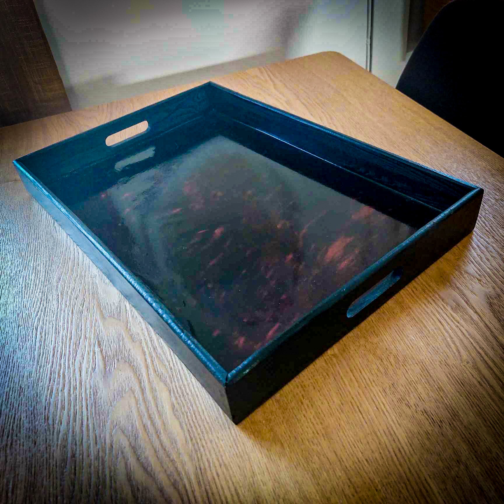 Stort pyntebrett i svart, med epoxy i botn med ein glittrande, raud finish.